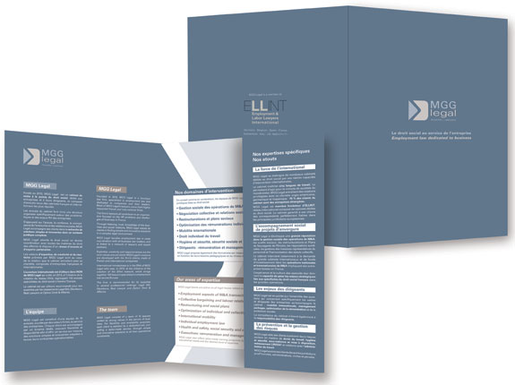 Logo, carte de visite et plaquette de présentation pour MGG Legal, cabinet d'avocats.